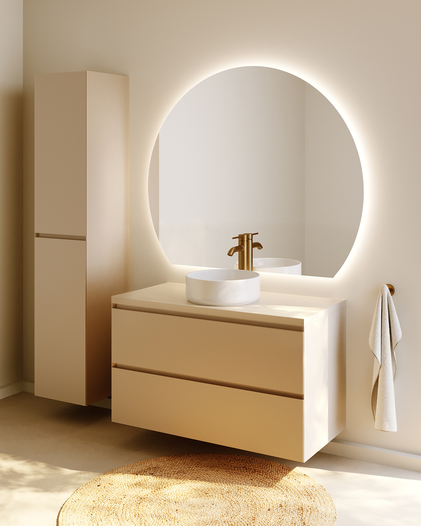 If you want a lighter look in the bathroom, the Spring-UP vanity unit in the colour Z24 Light Beige is an excellent choice. This soft lacquer colour exudes sophistication and elegance, but has a distinctly different undertone to greige shades such as Pebble Grey. That means: do not combine with Pebble Grey products, as this will create an unnatural colour break in the room.