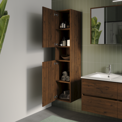 Der Schrank eignet sich zur Aufbewahrung all Ihrer Accessoires und Handtücher oder Dinge, die Sie lieber nicht in Sichtweite haben möchten. Der Hochschrank Porto hat zwei Türen, vier Fächer und ein offenes Fach.