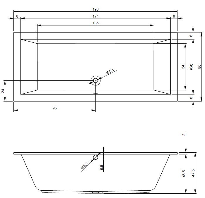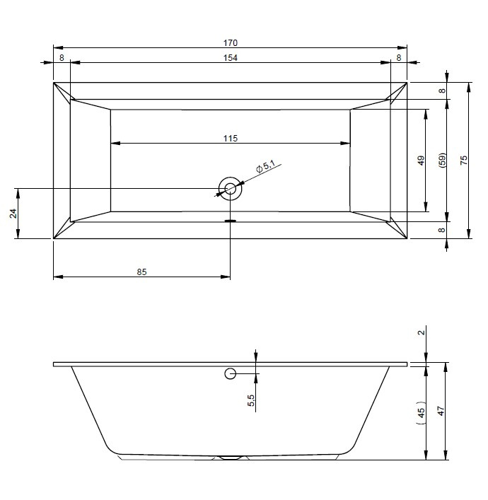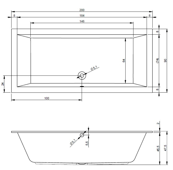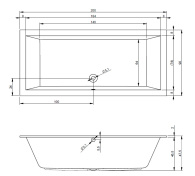 Einbau Badewanne mit schmaler Wannenrand, hochglanzweißes Acryl, rechteckig mit gleiche Innenform, seitlicher Ablauf.
