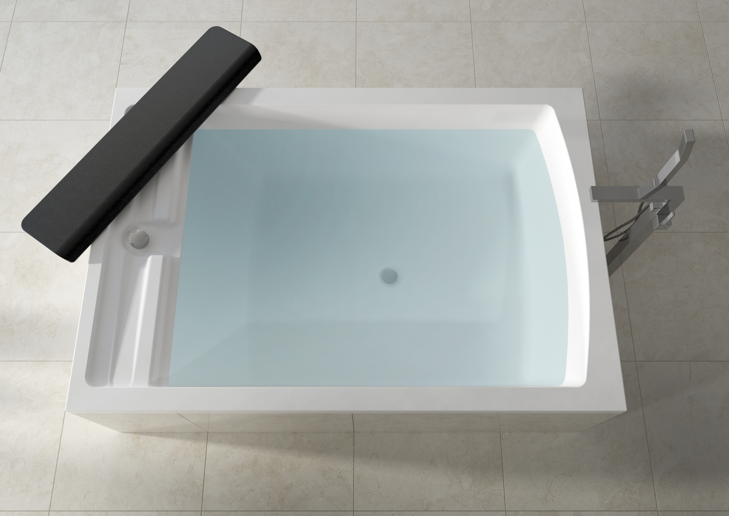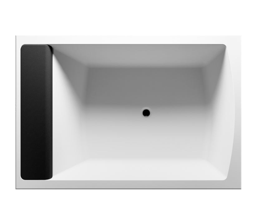 Einbau Badewanne, weiße Hochglanz-Acrylbadewanne mit großer schwarzer Kopfstütze. Auch mit den Whirlpoolsystemen erhältlich: Air, Flow, Joy of Bliss.