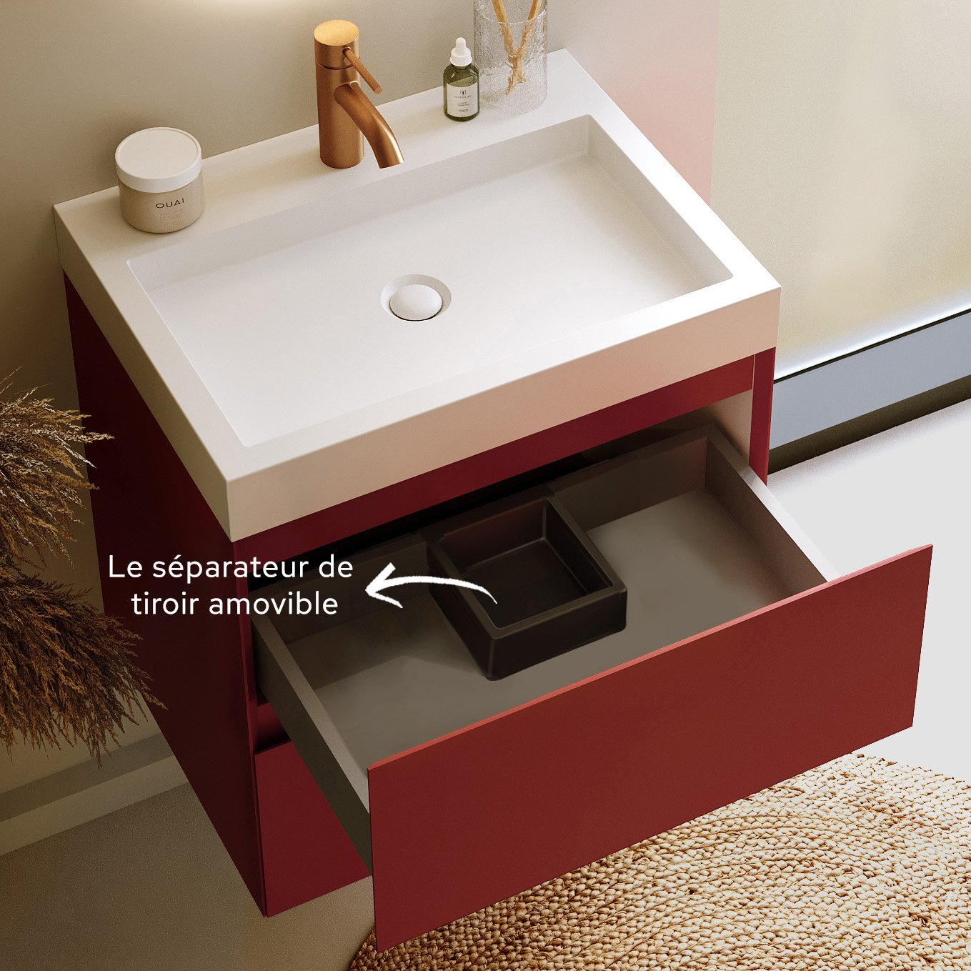 ✔ Le tiroir supérieur du meuble bas est toujours équipé d'une découpe pour siphon. Vous n'avez pas besoin de cette découpe ? Utilisez le séparateur de tiroir fourni pour combler l'espace. Vous avez besoin d'une découpe pour siphon (pour Spring Dew) ? Vous pouvez alors utiliser le séparateur de tiroir comme plateau de rangement supplémentaire.