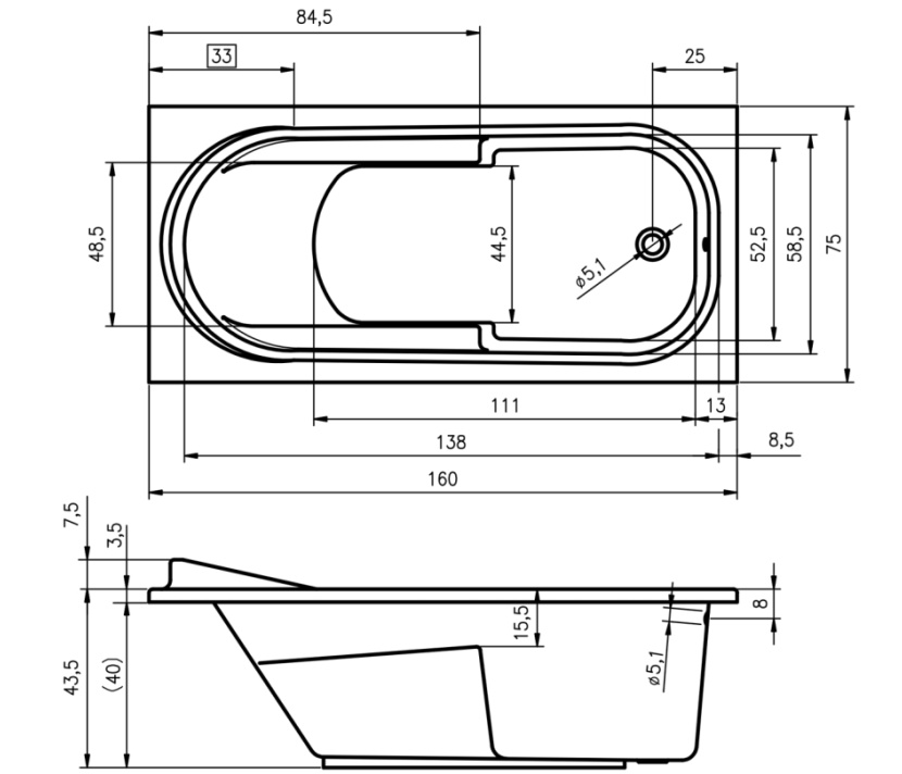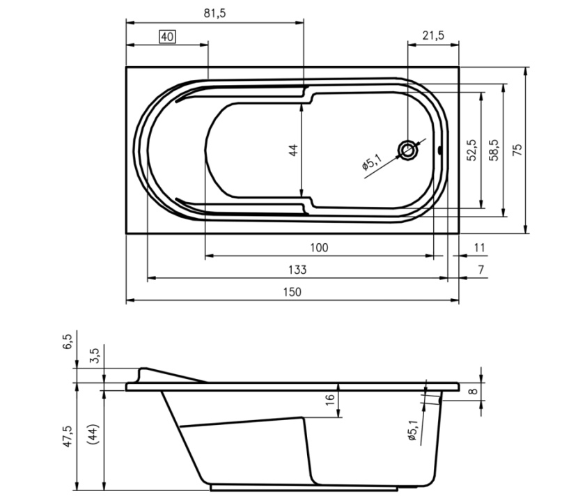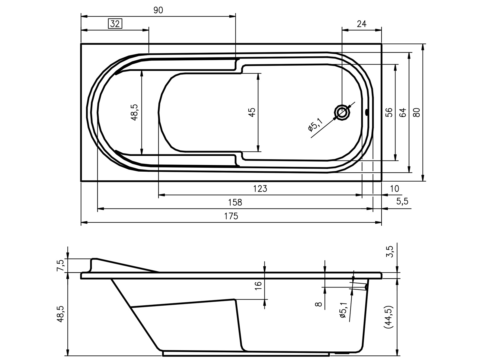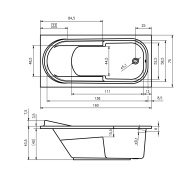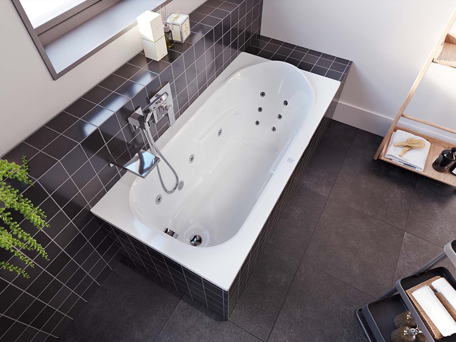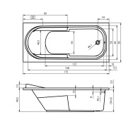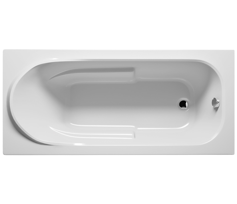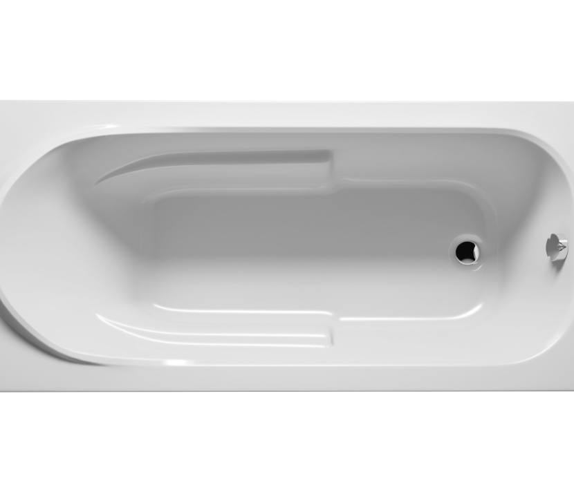 Beépített fürdőkád, magasfényű fehér akril fürdőkád, karfával, lábvégen vízelvezetővel.