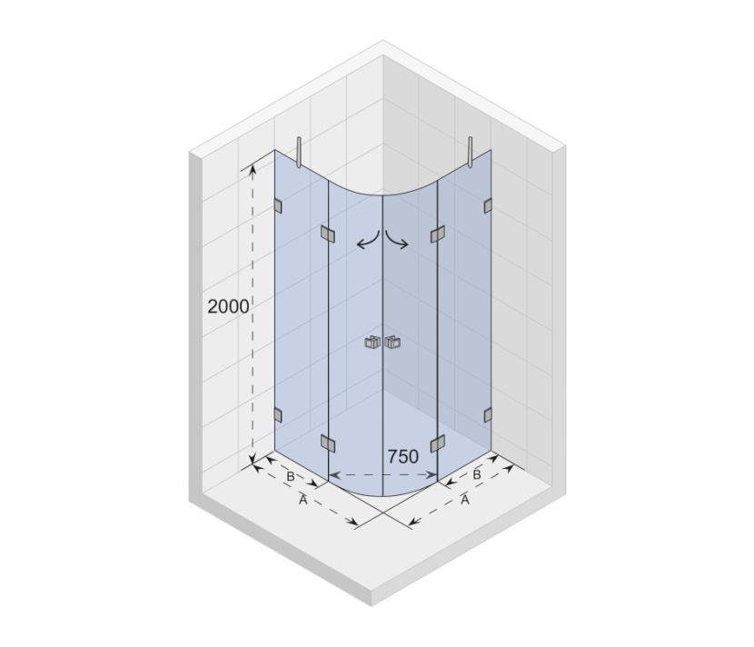 - Két fix üvegfal, két kifelé nyíló, ívelt ajtóval kombinálva