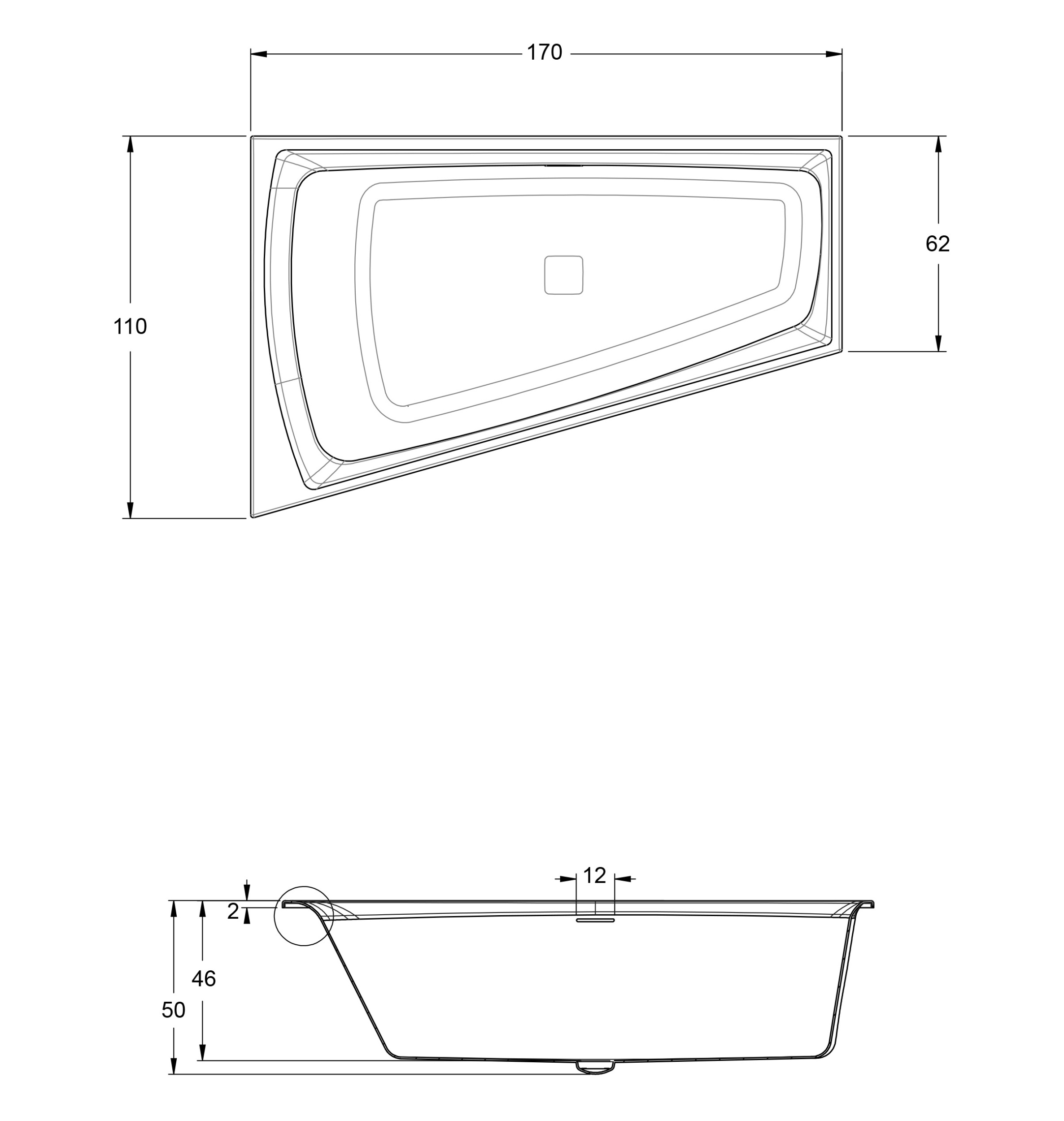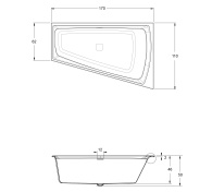 Süllyesztett kád, alsó kádperemel, magasfényű fehér akril, ferde modell, beépített túlfolyóval és felugró ablakkal. Kapható LED világítással a fejtámla mögött. A pezsgőfürdős rendszerekkel is elérhető: Air vagy Flow.