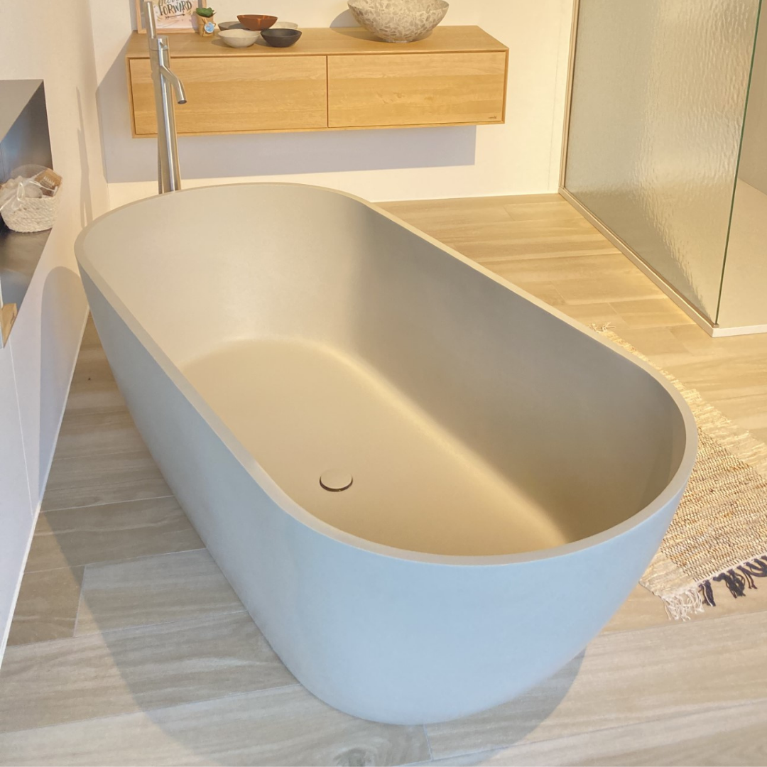 Het kleurenpalet dat je kiest bepaalt de sfeer in je badkamer en heeft een invloed op je gemoedstoestand. Kies voor aardse kleuren zoals zachtgroen, diep terracotta of neutrale grijstinten. Deze kleuren roepen een gevoel van rust en verbondenheid met de natuur op en ze vormen de perfecte achtergrond voor de andere natuurlijke elementen in je badkamer. Bijvoorbeeld het Bilbao bad en Escala waskom(men) in Pebble Grey.