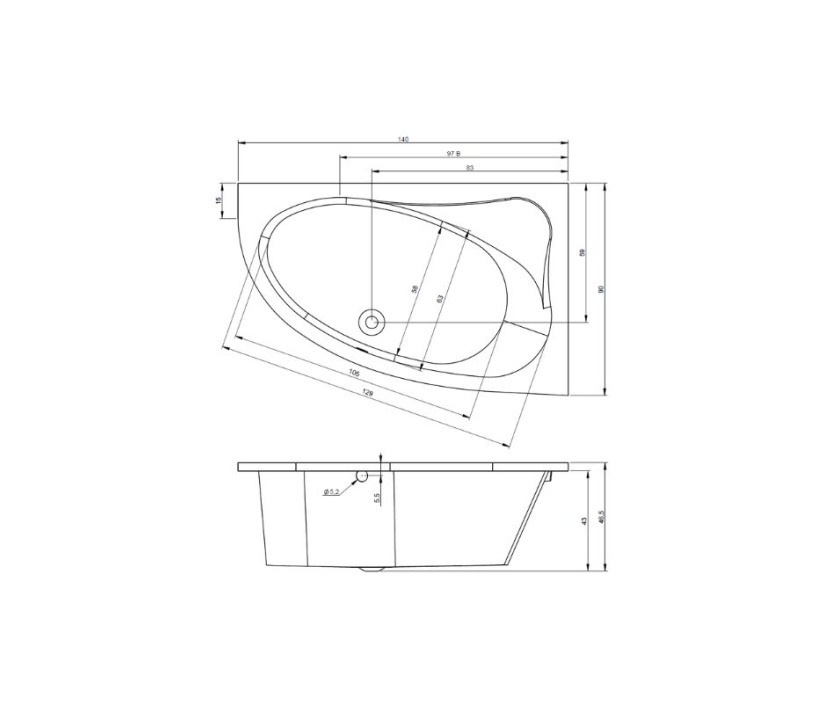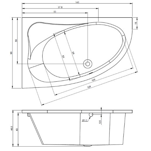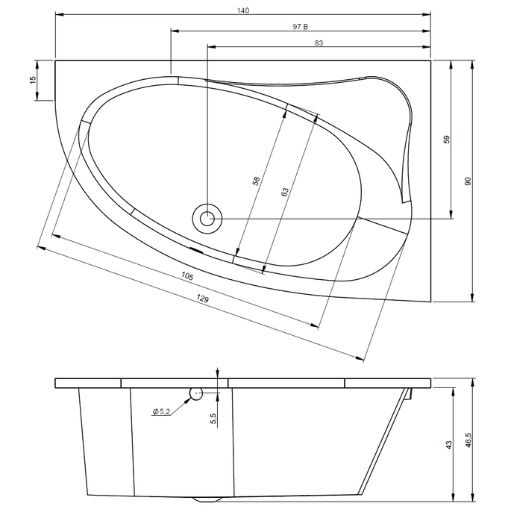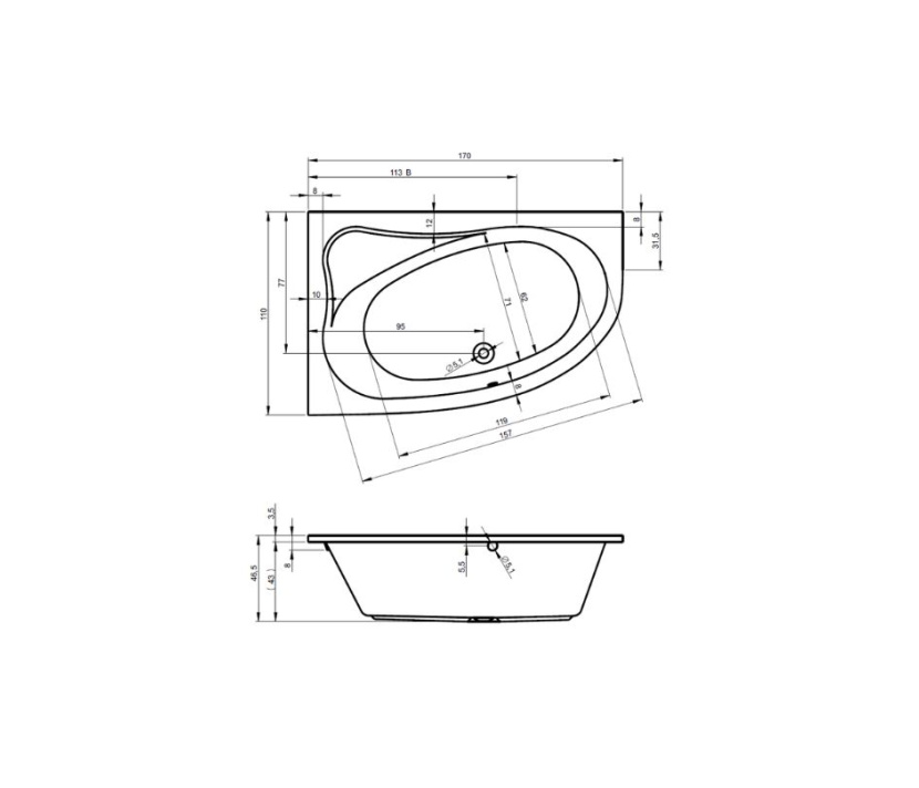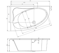 Inbouwbad, hoogglans wit acryl, asymmetrisch model, afvoer aan de instapzijde. Tevens verkrijgbaar met de whirlpoolsystemen: Air, Flow, Joy of Bliss.