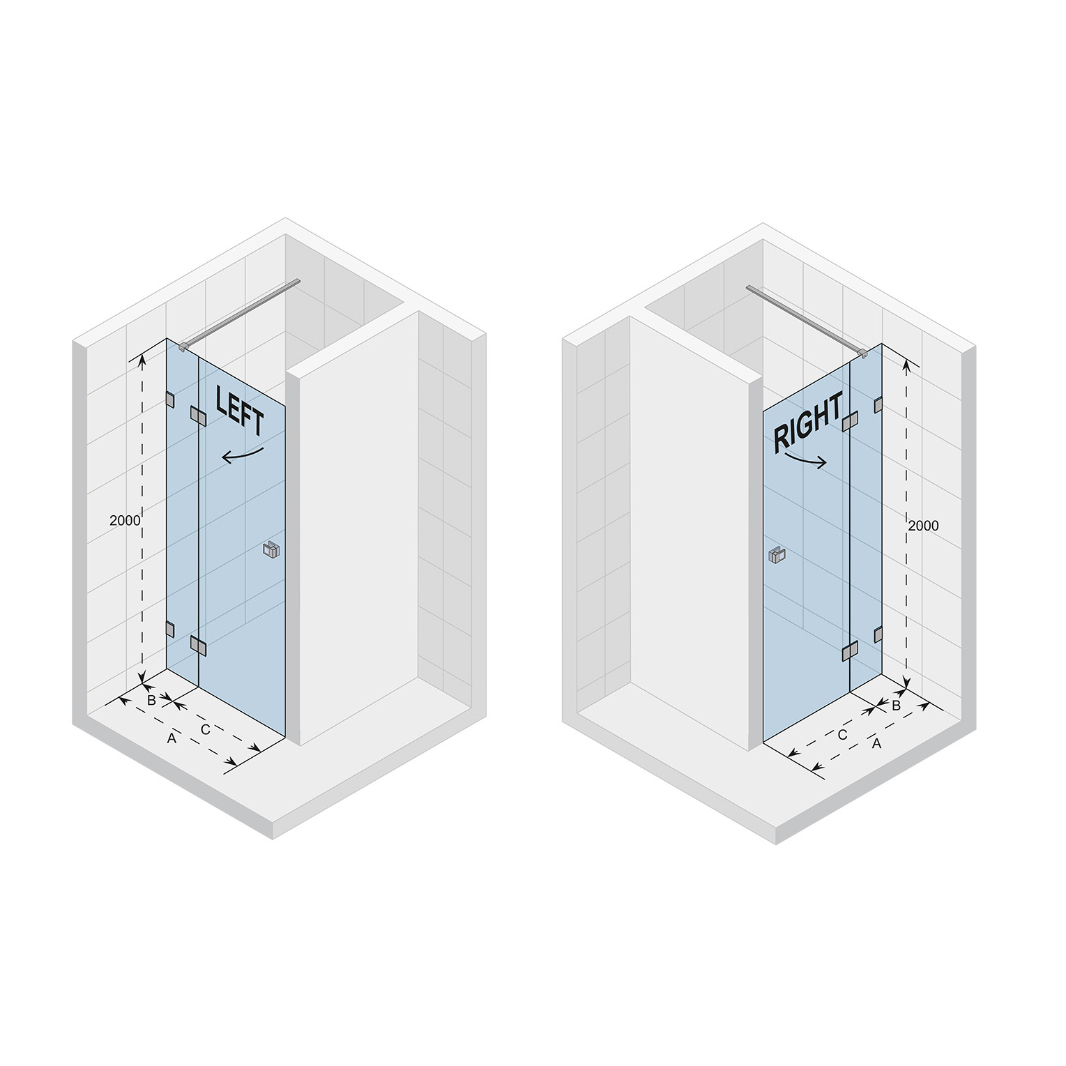 - Standaard cabines: Met bijgeleverde standaard beugel (1000 mm) voor deuren breder dan 1000 mm en > 1200 mm cabines. Deze kan ingekort worden tot de gewenste lengte.