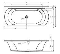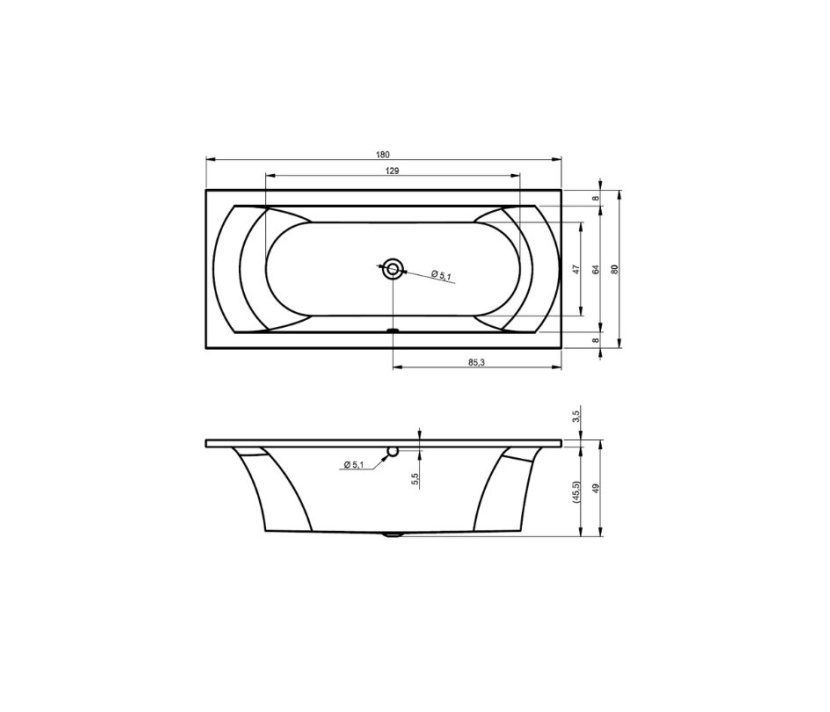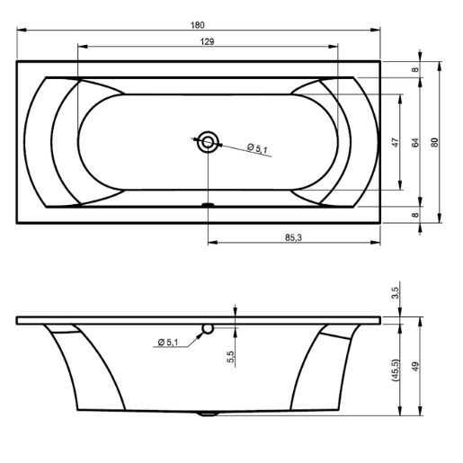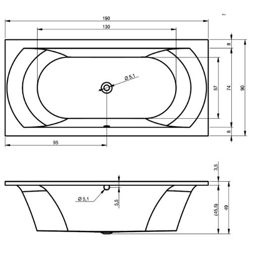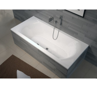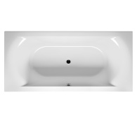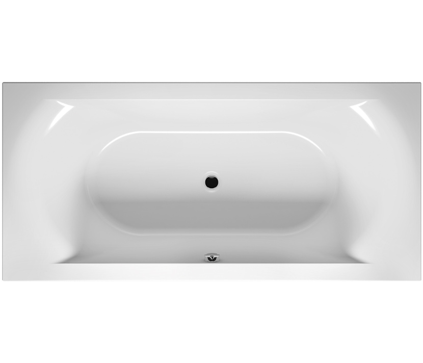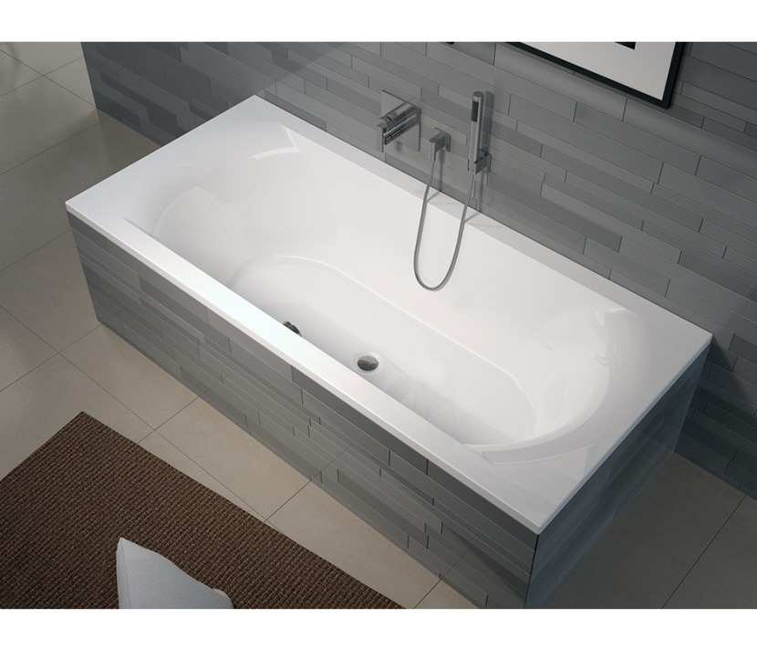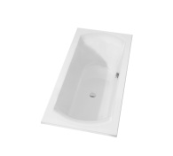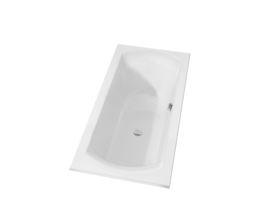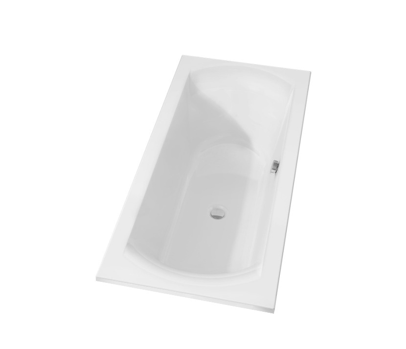 Встраиваемая ванна из белого глянцевого акрила, прямоугольная, с закругленной внутренней формой и боковым сливом.