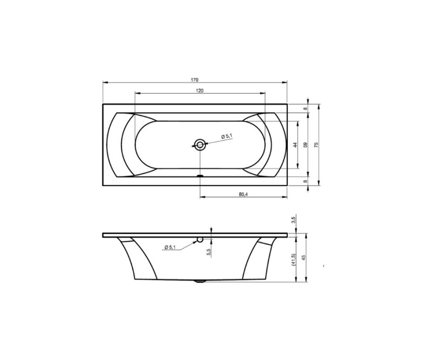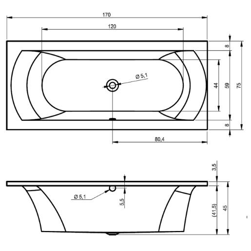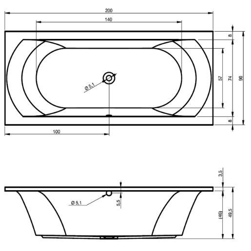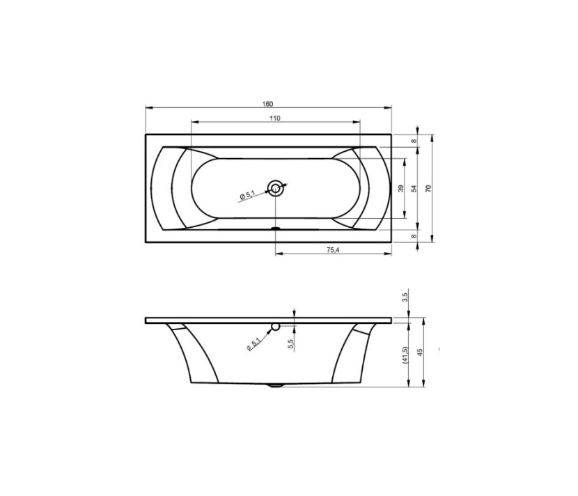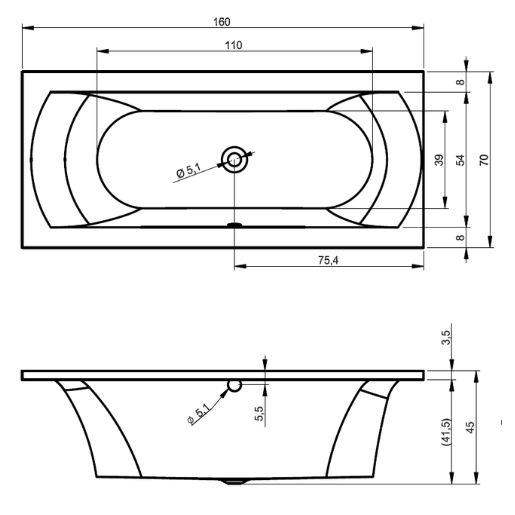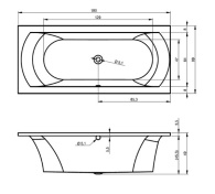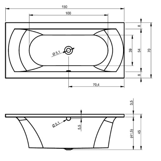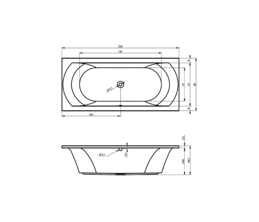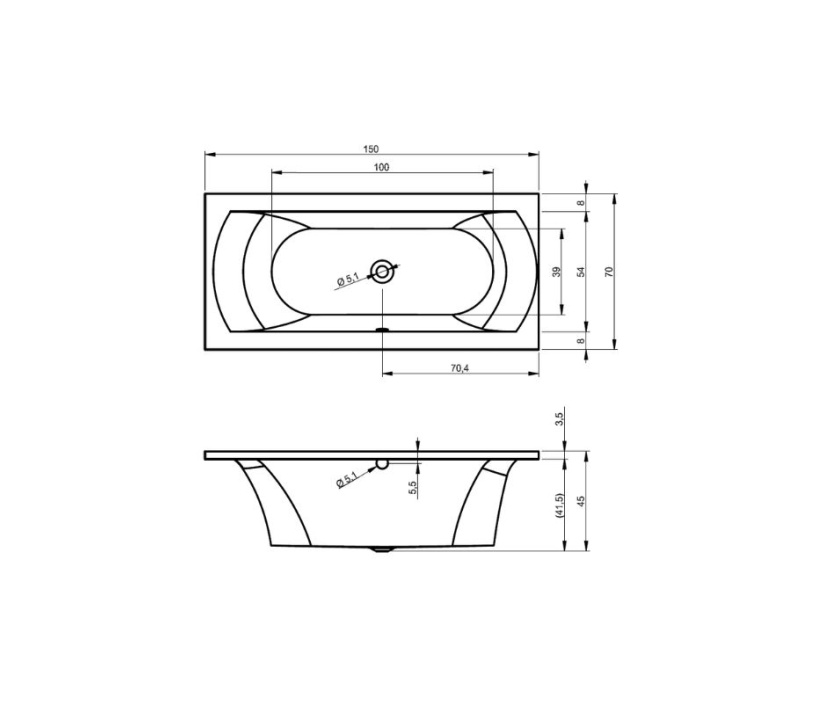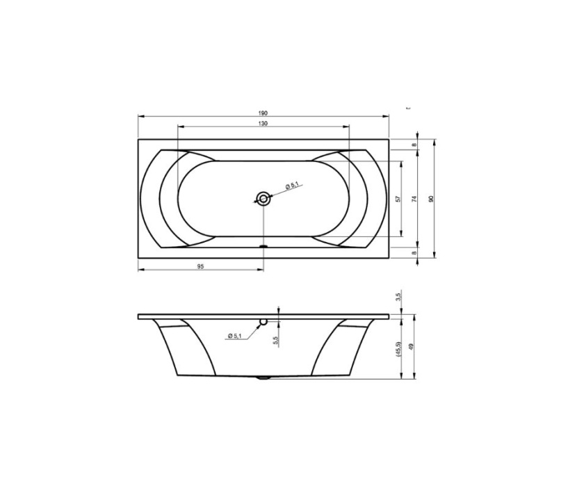 Встраиваемая ванна из белого глянцевого акрила, прямоугольная, с закругленной внутренней формой и боковым сливом.